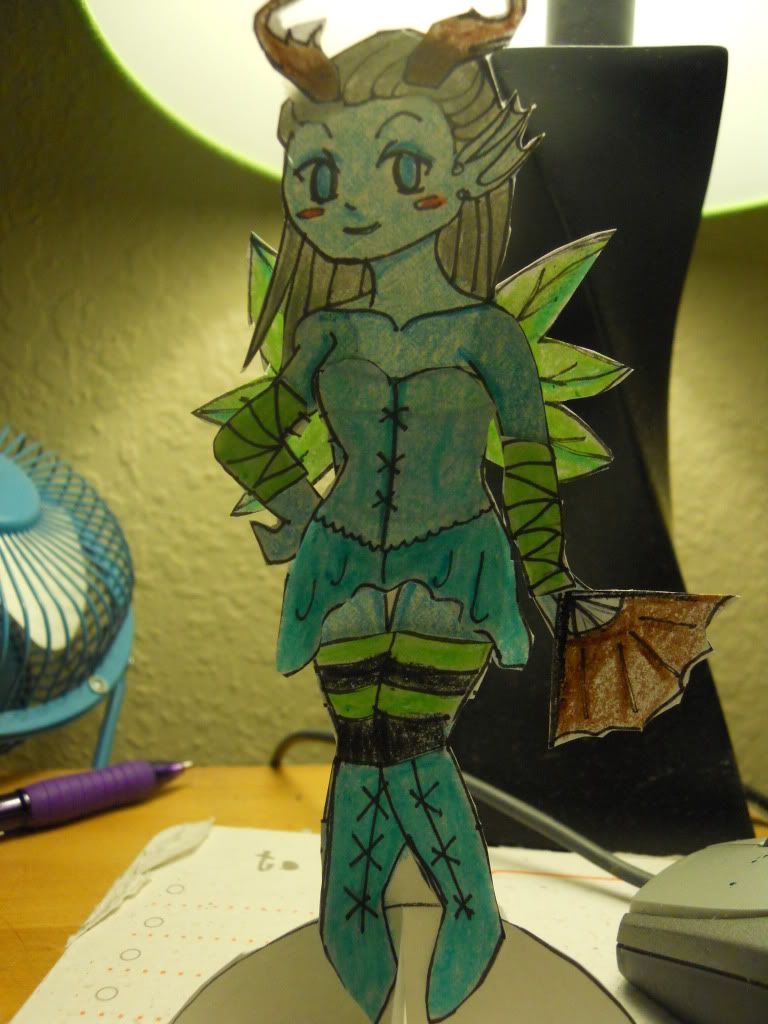 Comments: I made this paper doll using cardstock, printer paper, crayons, and sakura pens. I've never done something like this before, so it's a little messy! In it, my character is first wearing her n00b clothes, then her undies (this is the base of the doll), and then a complete outfit. The base skin is supposed to be the Saidon Base